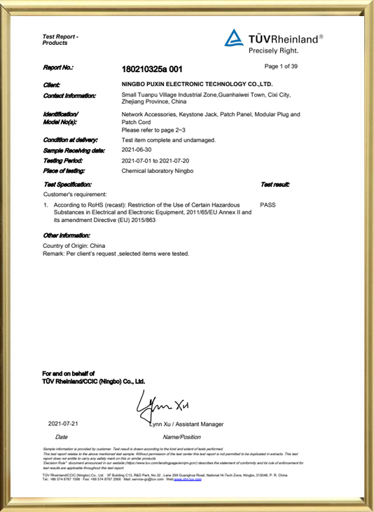 Ningbo Puxin Electronic Technology Co., Ltd, 15 yıldan fazla bir süredir kurulmuştur, bu da bakır Cat5E, Cat6, Cat6A, CAT7, CAT8, RJ45 konnektörü, yama kablosu ve diğer ilgili ürünler dahil entegre ağ kablolama ürünleri ve optik fiber ürünlerinin üretimi konusunda uzmanlaşmıştır.