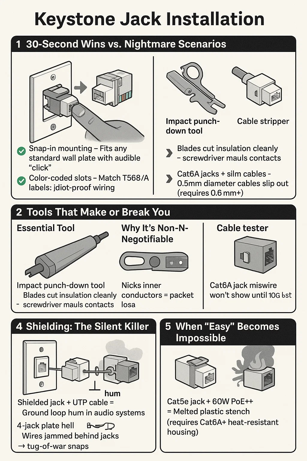 Anında Arıza Tuzakları: * Örgülü kablo denemesi – IDC bıçakları örgülü kabloları parçalar (yalnızca katı çekirdekli!). * Cat6A jakları ince kablolar – 0,5 mm çaplı kablolar kayar (0,6 mm gerektirir).