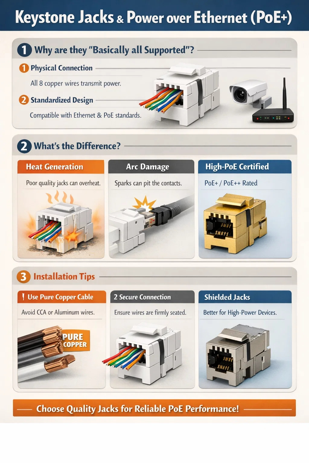 Standart ağ kablosu konnektörlerinin büyük çoğunluğu ( Keystone Jakları ) fiziksel olarak Ethernet Üzerinden Güç'ü (PoE) destekler, ancak tüm ürünler gerçek yüksek yükte çalışma altında eşit derecede güvenilir değildir.