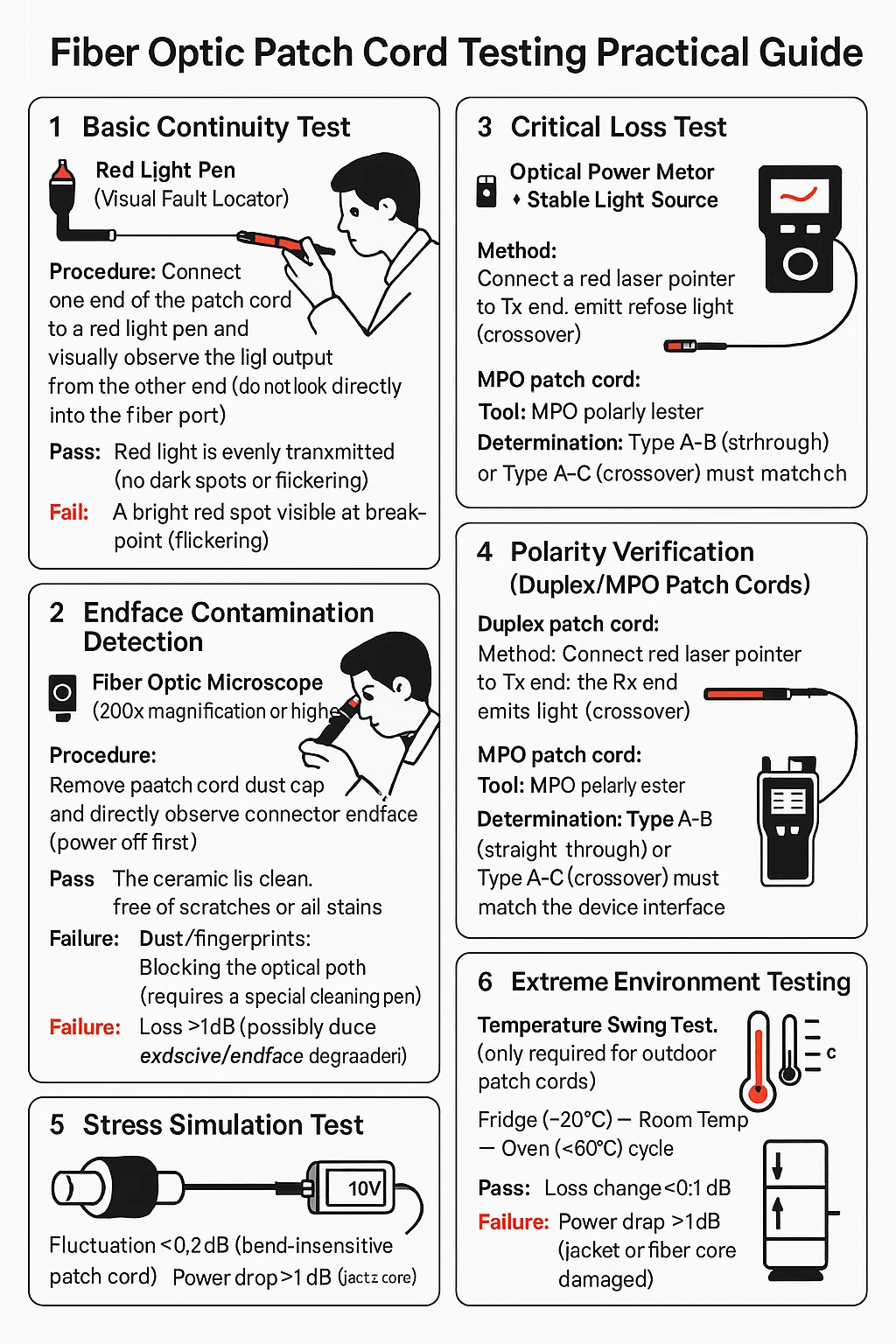Geçmek: Fluctuation ≤0.2dB (bend-insensitive patch cord). Failure: Power drop > 1dB (jacket or fiber core damaged).