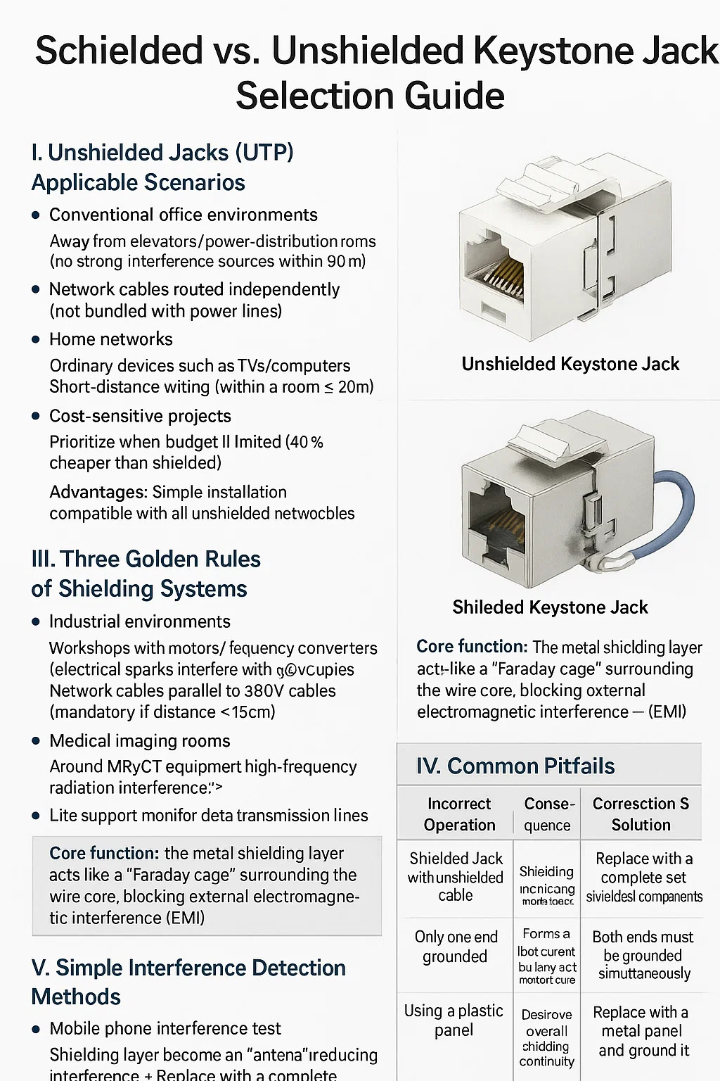 | UTP kablosuyla korumalı jakları kullanma | Kalkan bir anten görevi görerek paraziti çeker | Çalışmanın tamamını STP/FTP kablo korumalı bileşenlerle değiştirin |