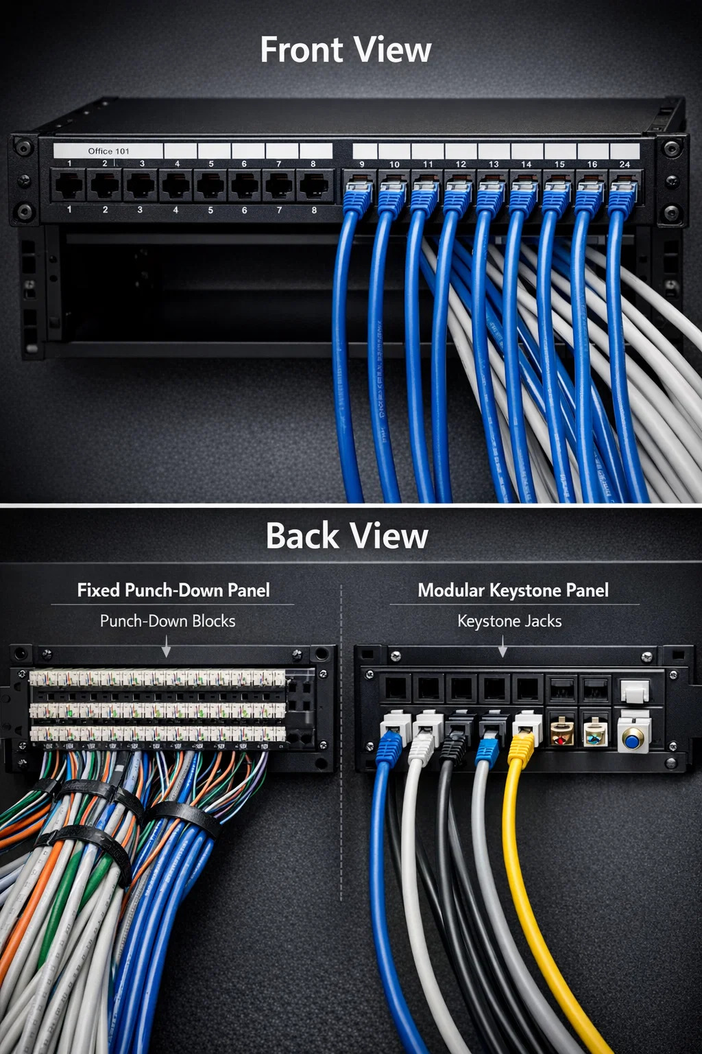 Bir görselin kimliğini anlamak ağ yama paneli , onu iki farklı tarafa ayırmak faydalı olacaktır: kullanıcıya bakan ön kısım ve altyapıya bakan arka kısım.