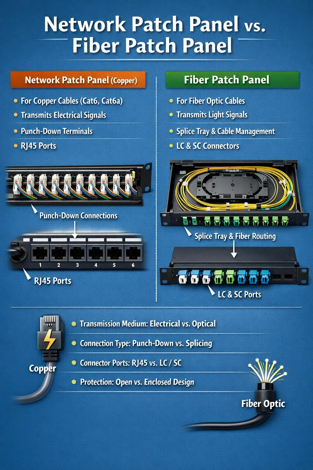 Ağ Patch Paneli: Bakır kablolar (yani yaygın olarak kullanılan Cat6 veya Cat6a ağ kabloları) için tasarlanmıştır. Bakır kabloları dahili olarak bağlar ve verileri elektrik darbeleri yoluyla iletir.