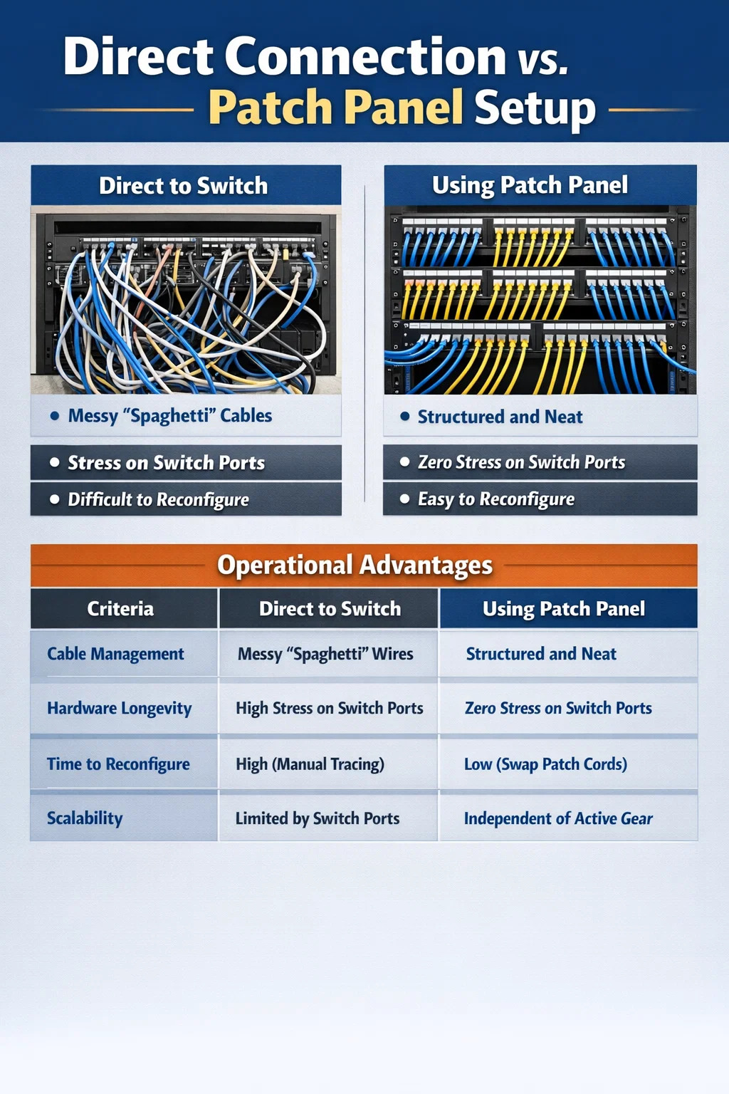 | Yeniden Yapılandırma Zamanı | Yüksek (kabloları manuel olarak izleme) | Düşük (1 metrelik yama kablosunu hareket ettirin) |